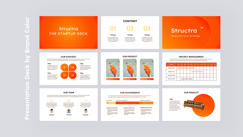 This orange deck is a vibrant, brand-focused PowerPoint template for consultants, creative entrepreneurs, and business leaders who value clarity, creativity, and confidence. With a bold orange theme that evokes energy and innovation, every slide is purpose-built to elevate presentations for brands with dynamic, expressive identities.